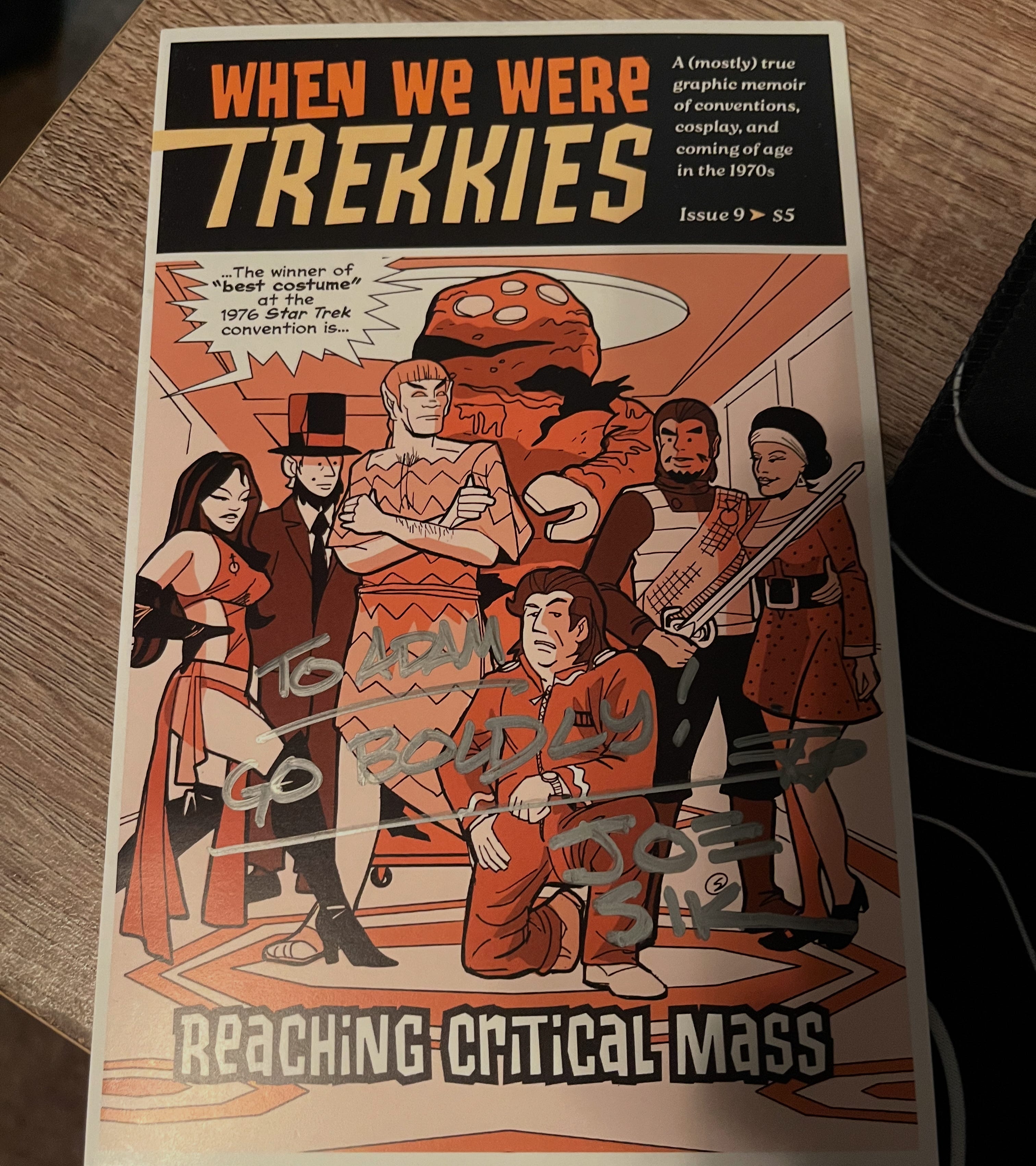 Another comic I gotta recommend is an Indie comics sensation called “When We Were Trekkies,” By Joe Sykoryak. A true life comedy/drama about the early days of Trek Conventions as told by someone who lived it! It gets my highest recommend and you can get all 10 issues with a nice handy slipcase at a discount price right here: https://www.birdcagebottombooks.com/products/when-we-were-trekkies-bundle-issues-1-10