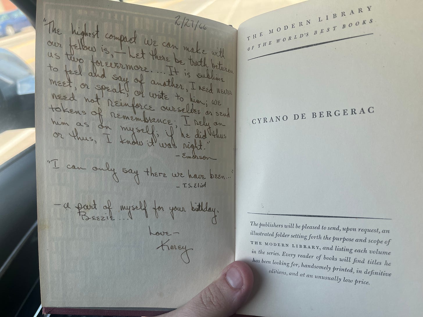 Speaking of books, I was at a thrift store yesterday and I scored a 1952 printing copy of CYRANO DE BERGERAC by Edmond Rostand. And inside was a written dedication to someone, lovingly written in 1966. I love when I find old books and in there it shows off its history a bit. Makes me feel like I am curating other people’s lives who might no longer be here, so a small piece of them is not forgotten. I wonder who these people were, where they came from, if they are still around now and did they enjoy the book. Every book has a story in addition to the one told inside its pages.