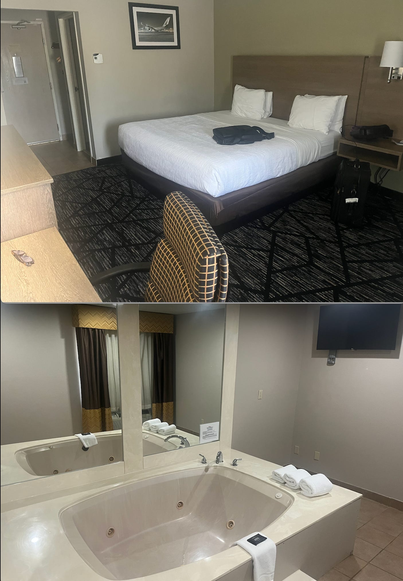 While downtown I had planned to hit “Stellas,” a nice burger place with GREAT food, arcade games and Lost in Space/Star Trek always playing on the TV. Talk about my home away from home! Unfortunately the hours online didn’t match the ones on the door, so it was closed. UGH. So I just hit a steakhouse for another yummy steak dinner and then checked into the hotel. I sprung for a jacuzzi room, which was pretty great!