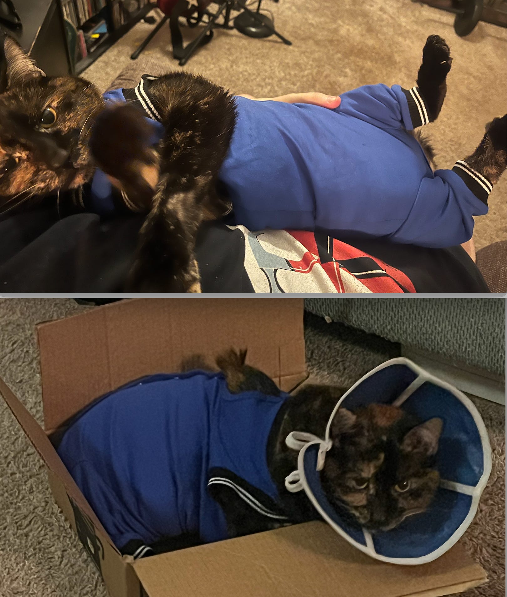 By the way, all week I have still been dealing with Lily and her weird belly rash. It gets better and then somehow she gets at it and licks it back to being red and puffy. Total spent on it now is $522. I am about to just give up. I’ve tried everything I could do. Some I read online is that it can go away on its own, so I am hoping that is the case. I’d love for her to stop peeing everywhere and being scared of the other two cats. I WANT MY HOUSE BACK!!! (she does look cute in her onezee though!)